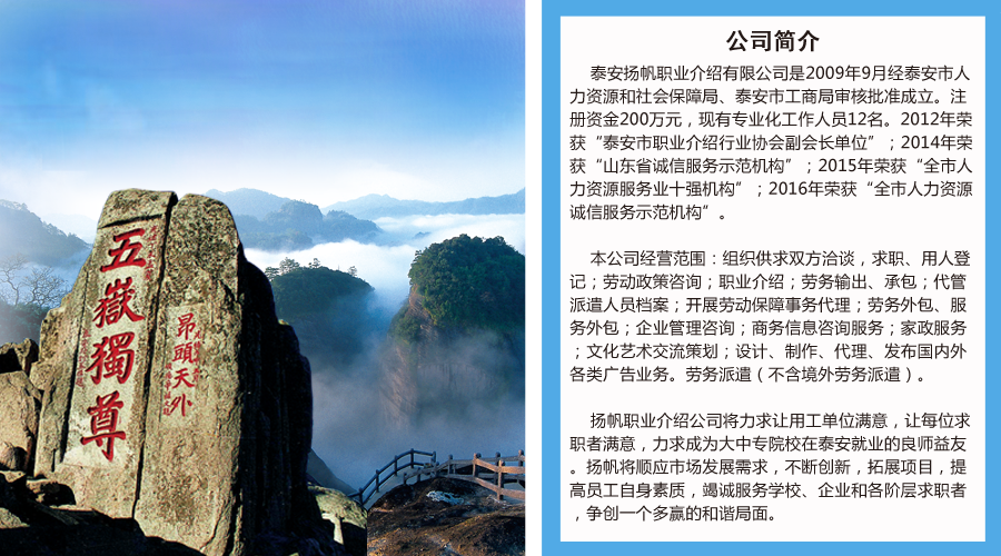 泰安揚(yáng)帆職業(yè)介紹有限公司是2009年9月經(jīng)泰安市人力資源和社會保障局、泰安市工商局審核批準(zhǔn)成立。注冊資金200萬元,現(xiàn)有專業(yè)化工作人員12名。2012年榮獲“泰安市職業(yè)介紹行業(yè)協(xié)會副會長單位”;2014年榮獲“山東省誠信服務(wù)示范機(jī)構(gòu)”;2015年榮獲“全市人力資源服務(wù)業(yè)十強(qiáng)機(jī)構(gòu)”;2016年榮獲“全市人力資源誠信服務(wù)示范機(jī)構(gòu)”。
